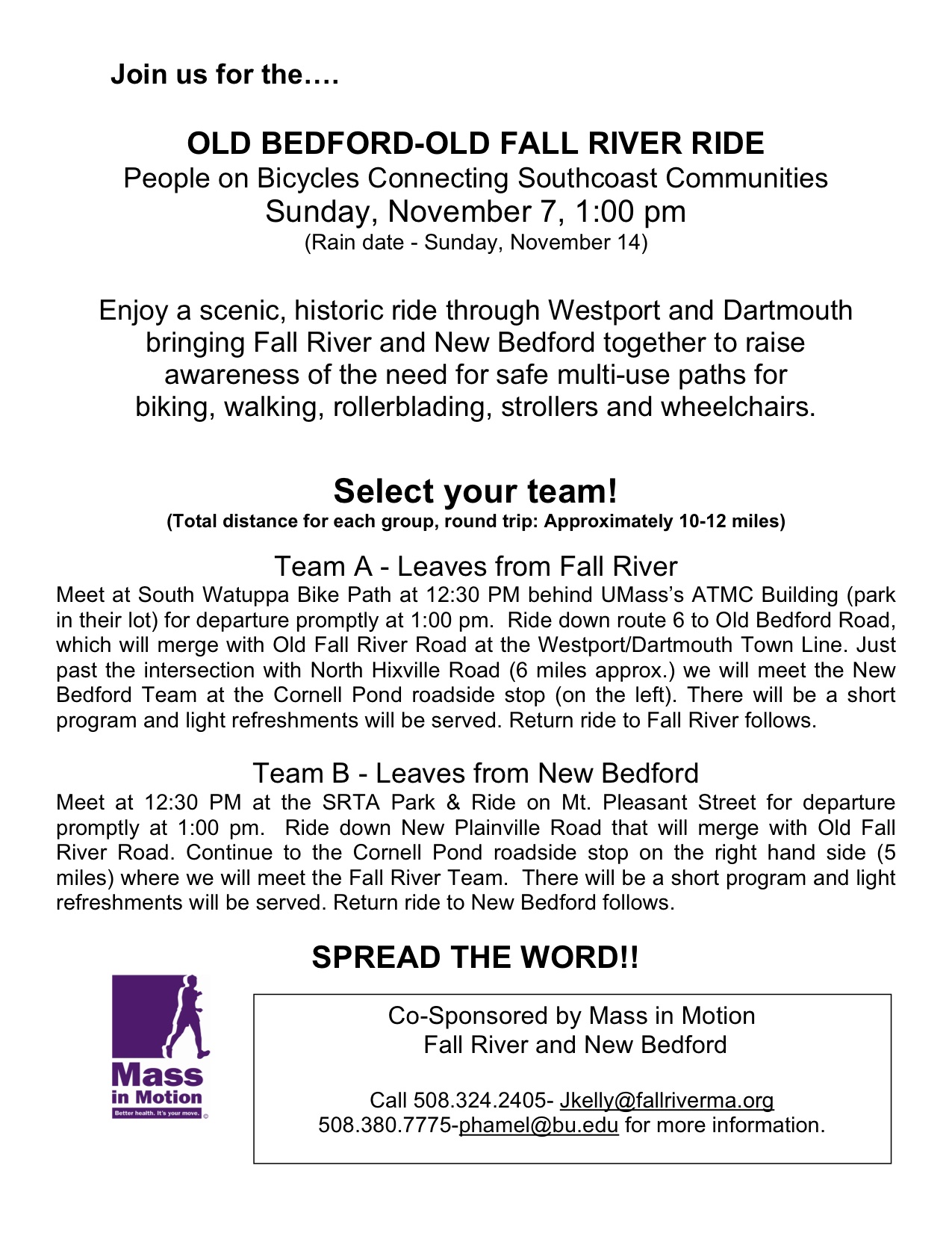 Mass in Motion is sponsoring a Bike Ride from Fall River to New Bedford. We would love it if you would attend.