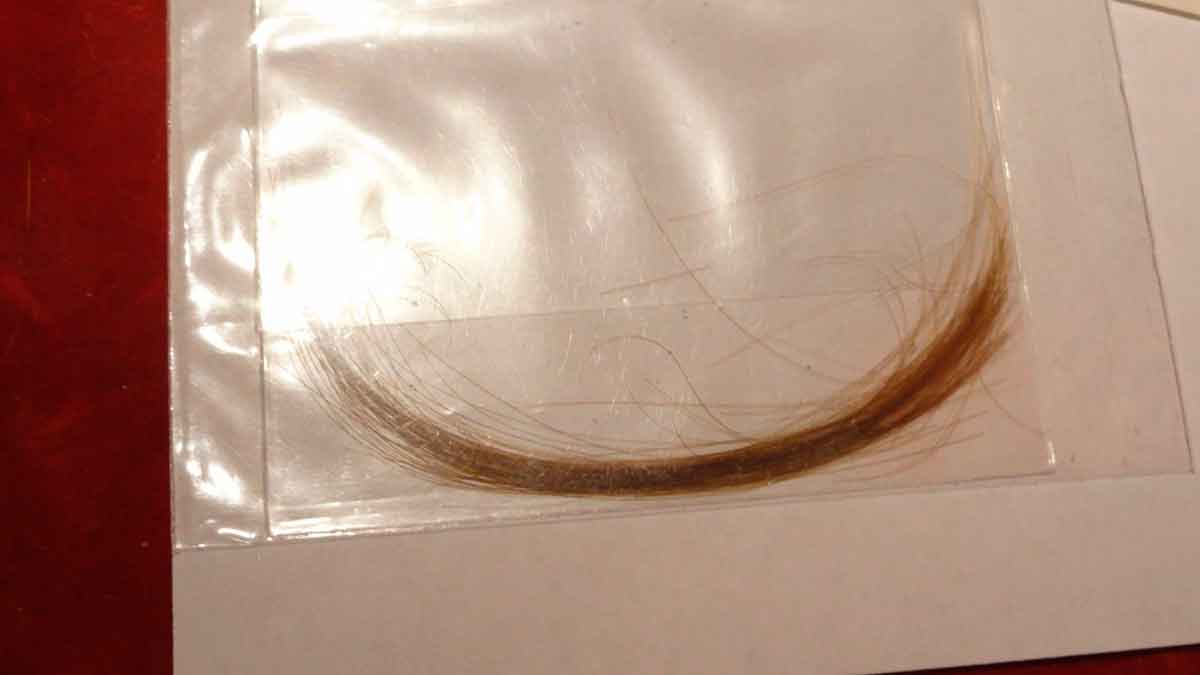 This is not the case with this hair. Instead, we have some very short stands of hair in a small, clean plastic baggie. The baggie is “sealed” with three very clean (no rust) staples. There is no indentation in this hair to indicate that it was part of the traditional lock of hair.