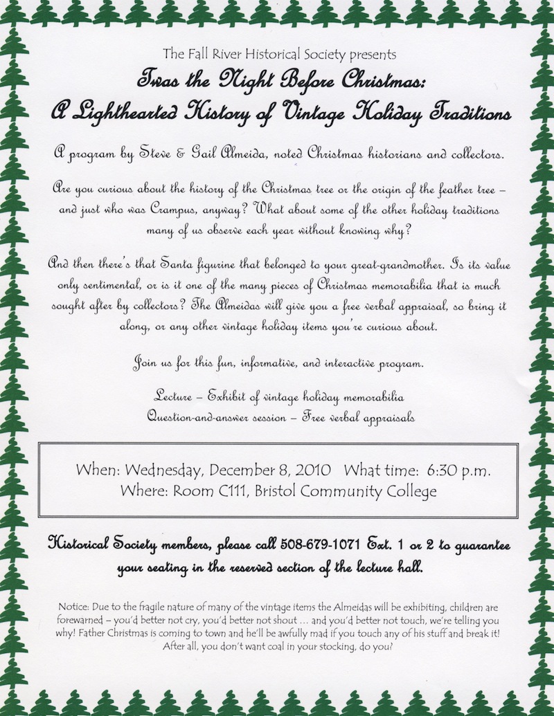 Tonight, the Fall River Historical Society is hosting an entertaining talk on the history of Christmas traditions at Bristol Community College, room C-111.