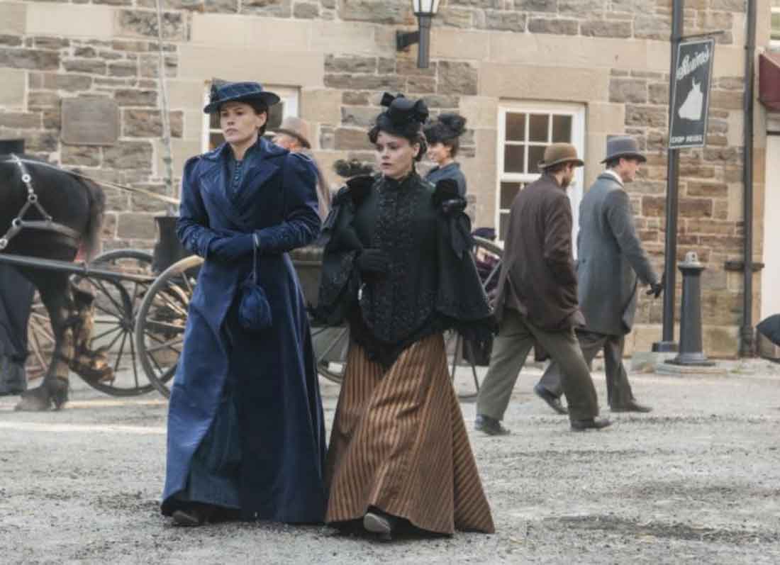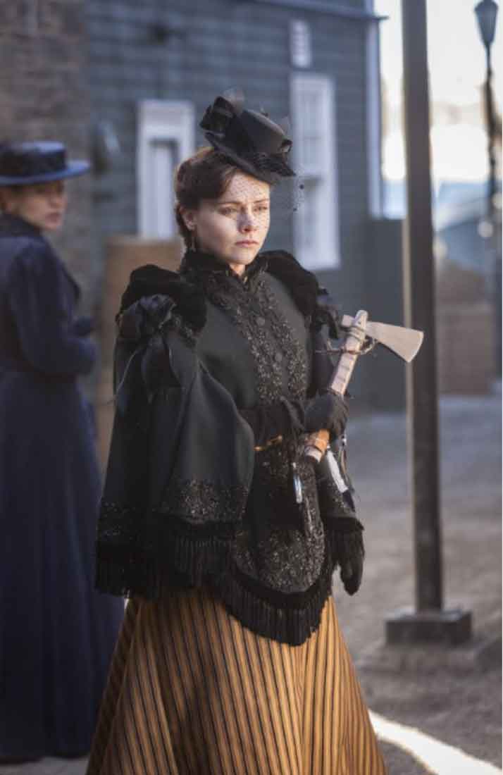 I was reminded of Arthur Penn’s Bonnie and Clyde while watching the first episode. The unusual editing and jump cuts in the opening sequence, as Lizzie and Emma are making their way into the lawyer’s office while everyone there looks up and sees her and knows her was engrossing and very well done. The jumping back and forth from the bloody murders of Andrew and Abby to the faces of the office employees worked to show us what was on their minds as this woman entered their space. And what would always be on everyone’s mind whenever they would see Lizzie Borden again in her lifetime.