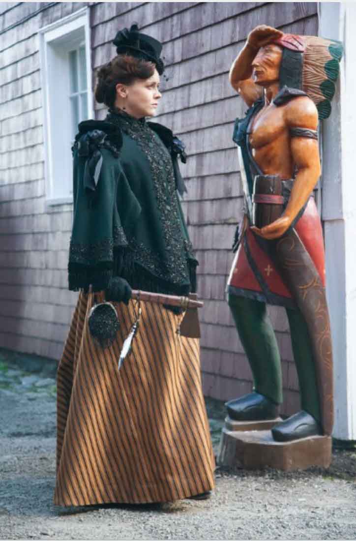 The juxtaposition of modern music, loud modern music, over the storyline was also compelling and a bold move. Lizzie belongs to the ages, it seems—transcending time and place to be with us now as we watch her skip her way down the streets of a very un-Fall River-like Fall River. And she has a good number of one liners too. When the children taunt her with the doggerel (Lizzie Borden Took an Axe) as she and Emma mind their own business, Lizzie turns around, grabbing a tomahawk from a cigar store Indian, and approaches them menacingly. They all run away, except for one child who says, “I’m not scared of you.”