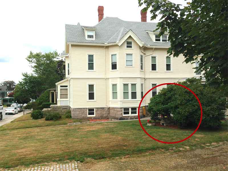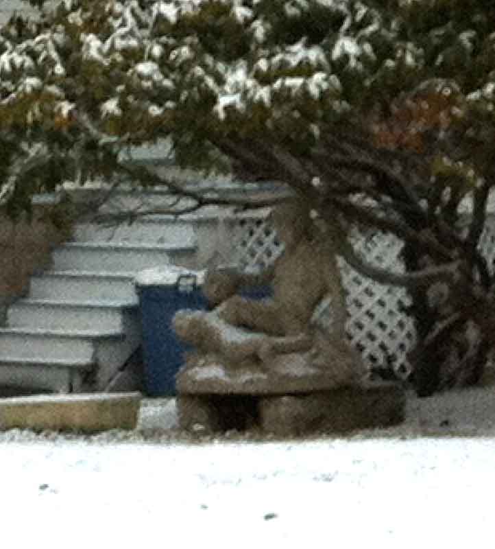 I am pleased to announce that the new owner has removed the statue from under the rhodadendran bush on the east side of the house.