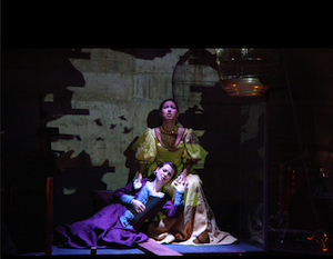 The showcase production of Steven Cheslik-DeMeyer, Tim Maner, and Alan Stevens Hewitt’s rock musical, Lizzie Borden, featured two secondary projection screens stage left and right. In keeping with the Victorian theme, these projections were designed to look like shadow puppets lit by candlelight.