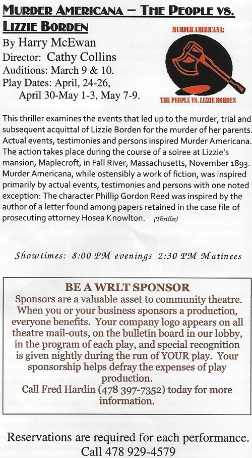 Last year, the Warner Robins Little Theatre in Warner Rogers, GA, produced a new play about Lizzie Borden, titled “Murder Americana: The People vs. Lizzie Borden.”
