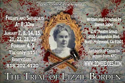 THE TRIAL OF LIZZIE BORDEN For all the talk of our sociocultural evolution, look no further than the sixth installment of the gory-glorifying serial killer movie series Saw, or the rapt attention given to an especially gasp-inducing murder trial, as a gauge of Americans’ fascination with the instinct to kill. Not just kill, either — the stronger the scent of blood, the hungrier the public’s appetite. You could finger Lizzie Borden’s 1892 trial as the trigger for this obsession. Writer-director Steven Sabel’s world premiere is adapted from the transcripts of the double hatchet murders of Abby and Andrew Borden, for which their daughter Lizzie was arrested and ultimately acquitted. Sabel wisely keeps the stage bare, focusing instead on recollections that twist so sharply you almost need a crib sheet to keep up. Jeremy Mascia’s lead prosecutor, Hosea Knowlton, relies on overbearing theatrics as his primary cross-examination tactic, but it’s in line with the typical portrayal of the courtroom in film; Annie Freeman is as wide- and wild-eyed as famous photos of the accused. The play feels lacking, but perhaps that’s more a reflection of our CSI culture than of the material. Tom Newman’s icy original music, particularly the hollow whispering of the children’s jump-rope rhyme “Lizzie Borden took an ax,” is literally hair-raising. (Rebecca Haithcoat). ZJU Theater Group, 4850 Lankershim Blvd., North Hollywood; Fri.-Sat., 8:30 p.m.; thru Feb. 5. (818) 202-4120.